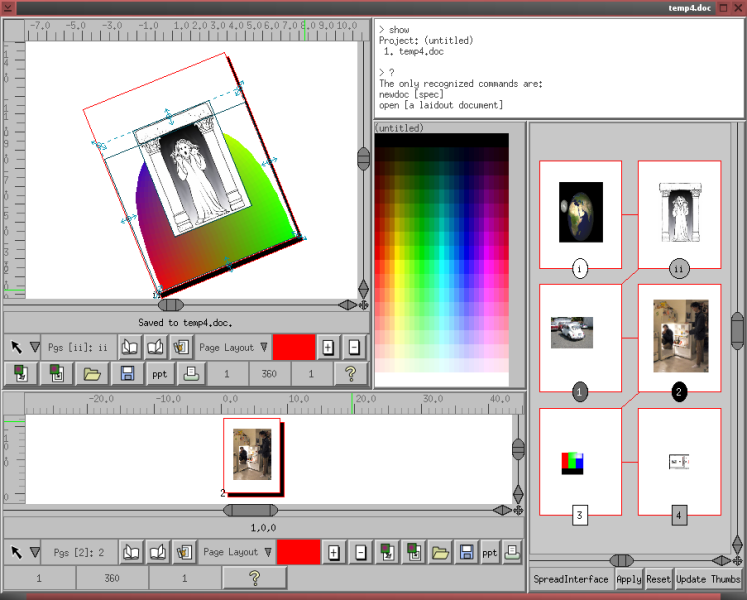 (14/17)![]() (version 0.05) Window arrangements Here is a shot that shows various features of Laidout, including a splittable main window, shown as a tatami mat sort of layout. You'll notice in the upper left that the whole view of the page is a bit rotated. In Laidout, you are not restricted to viewing pages as only portrait or landscape, like every other program in existence [note: there's been a recent flurry on Inkscape's dev mailing list in April 2007 about adding this feature]. Also in the upper left is the Object tool, which allows scaling, shearing, and rotating of multiple objects. It has handles to drag around, as seen in Inkscape, but there is also what I call a three point transform, in which you can define the center of scaling/rotation (control-left click), then click and drag any other point, and the objects are scaled and rotated to match where you drag. Or you can define the center, and also one other constant point (a second control-left click), then clicking and dragging a third arbitrary point will shear the image to match where you drag this third point, with the first two points staying where they are. Another feature seen in the lower right are definable page labels. The pages for this document are normally 0, 1, 2, 3, 4, and 5, but here you see the custom i, ii, 1, 2, 3, and 4. This is two page ranges, one with roman numerals, and the other with arabic numerals. The only drawback currently is that you have to enter the labels manually to a saved file. There isn't quite a point and click way to add page ranges. That will probably come in version 0.092. |