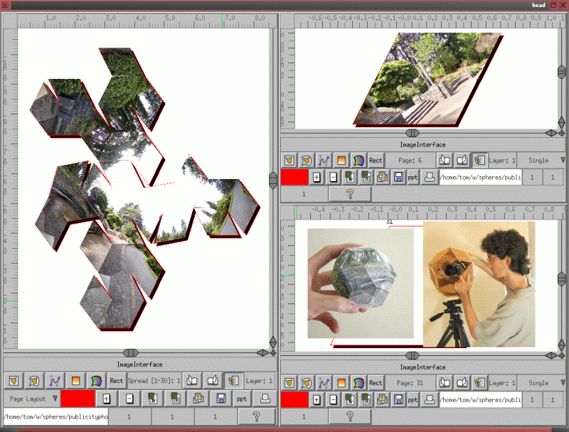(15/17)![]() (version 0.03.1) Nets This is an example of a Net Imposition. This particular net is a 30 sided Rhombic Triacontahedron layout, with a picture on each page. Each "page" is a kind of squashed square (rhombus). Also notice that each page clips the picture contained in the page. If you look in the pagestyle element of each page in a saved document, you can include or delete 'pageclips' to toggle whether or not a page will clip its contents. This also allows easy creation of centerfolds, for instance. In that case, you might want your picture to span 2 pages, so you would not want 'pageclips' set on those pages. Manipulating net impositions is very primitive in Laidout at the moment, but I have big plans in that direction, such as being able to unfold something like this triacontahedron any way that it can be unfolded. Cut this thing out, and you can fold it into a spherical-ish polyhedron. As you can see, I mounted a camera inside one of these things so that I can photograph spherical panoramas, such as this scenic staircase at the edge of the Portland, Oregon Rose Gardens. The colors would match more but for my impatience with the partly cloudy sky that day. |